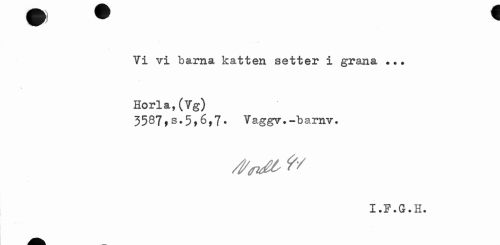//// #) //// Vi vi barna katten setter i grana ... //// i //// Horla,(Vg) //// 3587,s.5,6,7* Vaggv.-barnv. //// I. F. G. H • ////