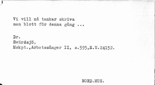 //// Ti vill nå tankar skriva men blott för denna gång ... //// Dr. //// Svärdsjö, //// Mskpt., Arbets sånger II, s.595,E.U.24152. //// NORD.MUS. ////
