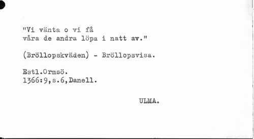 //// ( //// T j //// i //// "Vi vänta o vi få //// våra de andra löpa i natt av." //// (Bröllopskväden) - Bröllopsvisa, //// # //// Estl.Ormsö. //// 1366:9$s.6,Daneli. //// j //// i //// ULMÅ. //// i ////