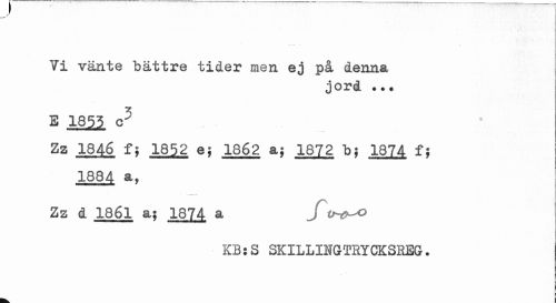 //// / //// Ti vänte bättre tider men ej på denna //// jord . //// E 1853 c5 //// Zz 1846 f; 1852 e; 1862 a; 1872 b; 1874 f; 1884 a, //// Zz d 1861 a; 1874 a J //// KB:S SKILLINGTRYCKSREG. ^ 1 ////