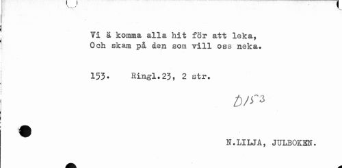 //// Il //// Vi ä komma alla hit för att leka, Och skam på den som vill oss neka. //// 153. Ringl* 23, 2 str. //// N.LILJA, JULBOKEN. ////