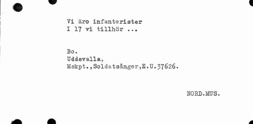 //// Vi äro infanterister I 17 vi tillhör ..• //// Bo. //// Uddevalla, //// Mskpt.,Soldatsånger,E.U.37626. //// HORD.MUS. //// M ////