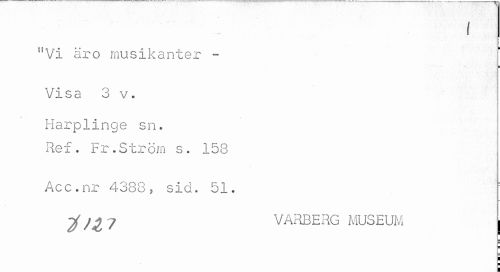 //// I //// "Vi äro musikanter - //// i //// Visa 3 v. //// Harplinge sn. //// Re f. Fr.S tr öm s. 158 //// Acc.nr 4388, sid. 51. //// $VARBEHG MUSEUM | //// ¦ ////