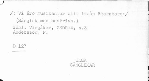 //// /; Vi äro musikanter allt ifrån Skaraborg:/ //// (Sånglek med beskrivn.) //// Sdml. Vingåker, 2855:4, s.3 Andersson, P. //// D 127 //// ULMA //// SÅNGLEKAR | //// ¦ ////