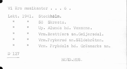 //// Vi äro musikanter . . . 6 . //// Lekt. 1941. Stockholm. //// n " So Skresta. //// 15 " Up. Alunda hd. Voxorne. //// 51 " Vrm.Brattfors sn. Geijex^sdal. //// n t? Vrm.Frykerud sn.Säldebråten. //// n " Vrm. Frykdals hd. Gräsmarks sn. //// D 127 //// ' NORD.MUS. //// ¦ //// h. ////