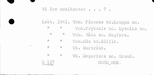 //// Vi äro musikanter . . . 7 . //// ^ Lekt. 1941. Vrm. Farnebo hö.Kroppa sn. //// u n Vrm.Frvkdals hd. Lysviks sn. //// 11 Vrm. Råda sn. Hagfors. ts 51 Vrm.Näs hd.Säffle. //// L r //// !l n Vb. Burträsk. //// n " Vb. Degerfors sn. Granö. EL 127 NORD.MUS. ////