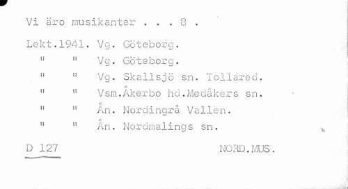 //// « //// Vi äro musikanter . . . 8 . //// Lekt.1941. Vg. Göteborg. 11 n Vg. Göteborg. n u Vg. Skallsjö sn. Tollared. //// o G //// f! " Vsm.Akerbo hd.Medakers sn. //// c 0 i //// n " An. Nordingra Vallen. //// c //// 11 " An. Nordmalings sn. % //// D 127 NORD.MUS. //// J i ////