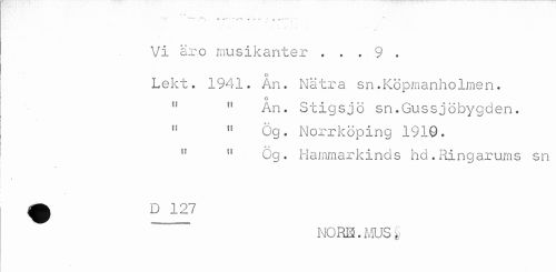 //// * o //// ' .'• ¦ „ » 'A ~ ¦^t *¦ T i, -T*--- //// Vi äro musikanter . . . 9 . //// o //// Lekt. 1941. An. Nätra sn.Köpmanholmen. //// o //// " " An. Stigsjö sn.Gussjöbygden. " " Ög. Norrköping 1910. //// A- //// u u Cg. Hammarkinds hd.Ringarums sn //// « //// ~ NORE. MUS ii ////