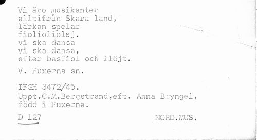 //// Vi äro musikanter //// alltifrån Skara land, //// 1ark a n spe1ar //// fiolioliolej. //// vi ska dansa //// vi ska dansa? //// efter basfiol och flöjt. //// V. Fuxerna sn. //// v //// IFGH 3472/45. //// Uppt.C.M.Bergstrand,eft. Anna Bryngel, född i Fuxerna. //// D 127 NORD.MUS. //// i ////
