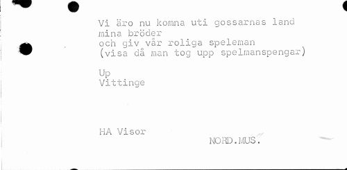 //// Vi äro nu komna uti gossarnas land mina bröder //// •och giv vår roliga speleman //// (visa då man tog upp spelmanspengar) //// Up //// Vittinge HA Visor //// NORD.MUS. ////