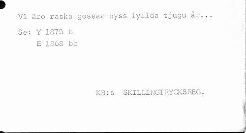 //// ¥ //// Vi äro raska gossar nyss fyllda tjugu år... //// Se: Y 1875 b E 1868 bb //// i //// KB:s SKILLINGT RYCKS REG. //// t //// ___J ////