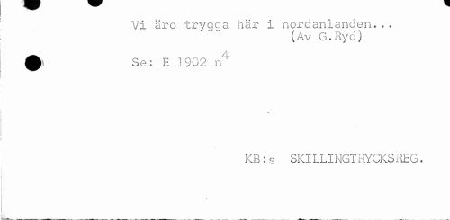 //// Vi äro trygga här i nordanlanden... //// (Av G.Ryd) //// 0 Se: E 1902 n4 //// » //// KB:s SKILLINGTRYCKSREG. ////
