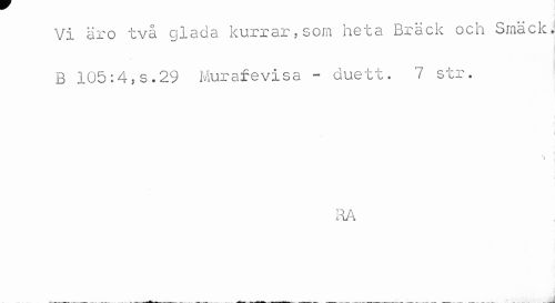 //// Vi äro två glada kurrar,som heta Bräck och Smäck. B 105:4,s.29 Murarevisa - duett. 7 str. //// i //// * //// i //// i //// RA //// . ... ... - ~ . :J ////