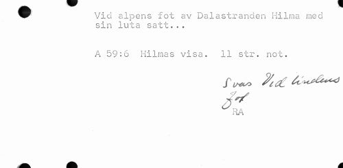 //// Vid alpens fot av Dalastranden Hilma med sin luta satt... //// A 59:6 Hilmas visa. 11 str. not. //// RA ////