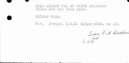 //// Hvid alpens fot af dalös stranden Hilma med sin luta satt. //// Hilmas visa. //// 5:4. J-stad. I.N.E. Slips visb. nr 12. //// o ^ //// a B V ////