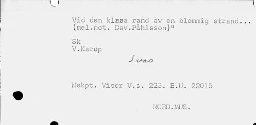//// v //// Vid den kissa rand av en blommig strand... (mel.not. Dav.Påhlsson)" //// Sk //// V.Karup //// J //// Mskpt. Visor V.s. 223. E.U. 22015 //// NO RD. MUS . ////