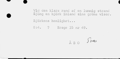 //// Vid den klara rand af en lummig strand ^ Sjöng en björk ibland sina gröna visor. //// Björkens hemlighet... 8:4. ? Brage 15 nr 49. //// Å B O ^ ////