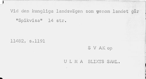 //// Vid den kungliga landsvägen som genom landet går "Spikvisa" 14 str. //// 11482, s.1191 //// S V AK op ULMA BLIXTS SÅML. //// i ¦ //// ¦ //// i ¦ //// k i ////