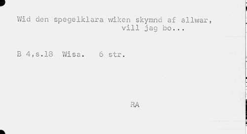 //// I //// Wid den spegelklara wiken skymnd af allwar, T //// vill jag bo. . . //// B 4,s.18 Wisa. 6 str. //// i //// RA //// k ' i ////