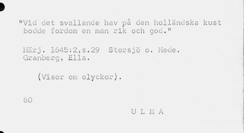 //// 9 //// nVid det svallande hav på den holländska kust bodde fordom en man rik och god.n //// Härj. 1645:2,s.29 Storsjö o. Hede. //// Granberg, Ella. //// (Visor om olyckor) . //// i //// i //// i //// 60 //// U L M A //// i i //// i ////