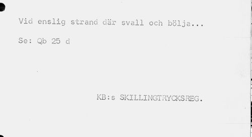 //// 9 //// Vid enslig strand där svall och bölja... Se: Qb 25 d //// I //// : //// « //// I //// KB:s SKILLINGTRYCKSREG. //// | //// k. ////