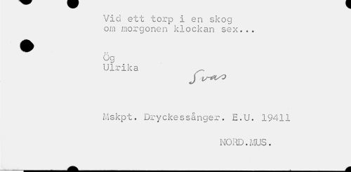 //// Vid ett torp i en skog //// om morgonen klockan sex... • * //// Og //// Ulrika //// JtrtfUO //// Mskpt. Dryckessånger. E.U. 19411 //// NORD.MUS. //// ---f åtk, V__ ////
