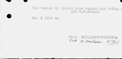 //// Vid femton år fyllda jolev sfugan mig trång. . //// (Av N.P.Adahl) //// ® Se: E 1884 cc //// KB:s SKlLLINGTRYCKS REGp ////