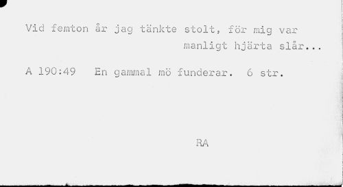 //// ( //// c //// i //// i //// t //// Vid femton år jag tänkte stolt, för miq var //// manligt hjärta slår... //// i //// i //// A 190:49 En gammal mö funderar. 6 str. j //// i //// I //// RA //// t | //// __- _i_- __-__ - _I--- - -_ - __ - _ I I1MIII — _—___._i_— - _J ////