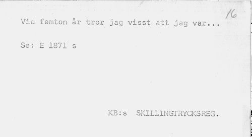//// Vid femton ar tror jag visst att jag var... Se: E 1871 s //// KB:s SKILLINGTRYCKSREG. I //// ¦ ////