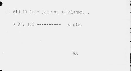 //// t y | //// ' " Vid 15 åren jag var så gläder... //// B 90, s.6--- 6 str. //// ¦ I //// RA I //// E | //// g i //// k. ////