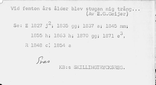 //// Vid femton års ålder Solev stugan mig trång... //// (Av E.G.Geijer) //// i //// Se: E 1827 j2; 1835 gg; 1837 a; 1845 mm; //// 1855 h; 1863 h; 1870 gg; 1871 e3, R 1848 c; 1854 a //// KB:s SKILLINGTRYCKSREG. //// ¦ ¦ //// i //// ¦ //// | //// tv I ////