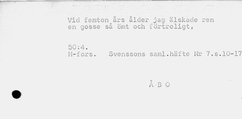 //// tffr - " v » * //// Vid femton års ålder jag älskade ren en gosse så ömt och förtroligt, //// 50:4. //// H-fors. Svenssons saml.häfte Nr 7.s.10-17 //// ÅBO //// "f # ////