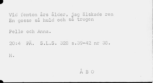 //// w //// Vid femton års ålder, jag älskade ren En gosse så huld och så trogen //// Pelle och Anna. //// 20:4 PÄ. S.L.S. 328 s.39-42 nr 38. //// N //// i V t //// •i //// ÅBO //// k___ ////
