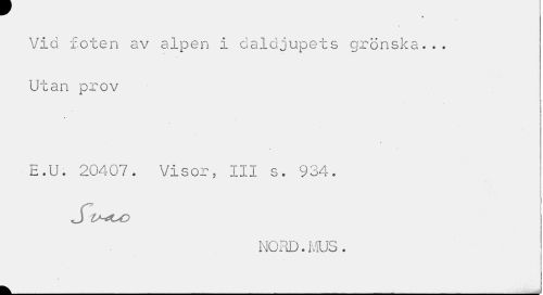 //// w //// » //// Vid foten av alpen i daldjupets grönska... //// Utan prov » //// E.U. 20407. Visor,. III s. 934. //// St^a^o //// NORD.MUS. ////