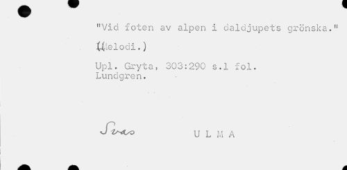 //// t!Vid foten av alpen I daldjupets grönska." ttlelodi.) //// Upl. Gryta, 303:290 s.l fol. Lundgren. //// J U L M A //// ä^ M ////