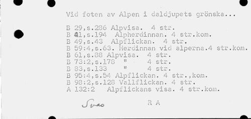 //// Vid foten av Alpen i daldjupets grönska,.. //// A //// B 29, s.286 Alpvisa. 4 str. //// B 31,s.194 Alpherdinnan. 4.str.kom. //// B 49,s.43 Alpflickan. 4 str. //// B 59:4,s.63. Herdinnan vid alperna.4 str.kom. //// B 61,s.8S Alpvisa. 4 str. //// B 73:2,s.178 n 4 str. //// B 83, s. 133 tf 4 str. //// B 95:4,s.54 Alpflickan. 4 str.,kom. //// B 98:2,s.128 Vallflickan. 4 str. //// A 132:2 Alpflickans visa. 4 str.kom. ////