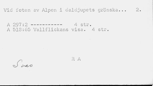//// J //// Vid foten av Alpen I daldjupets grönska... 2. //// a 2 9 i : 2 ~ —-—" - - - - 4 str. //// A 513:65 Vallflickans visa. 4 str. //// Q A //// SI n A --- ////