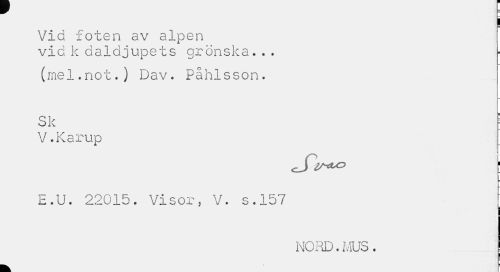 //// I //// Via foten av alpen //// vid k daldjupets grönska... //// (mel.not.) Dav. Påhlsson. //// Sk j //// V.Karup //// E.U. 22015. Visor, V. s.157 [ //// NORD.MUS. ////