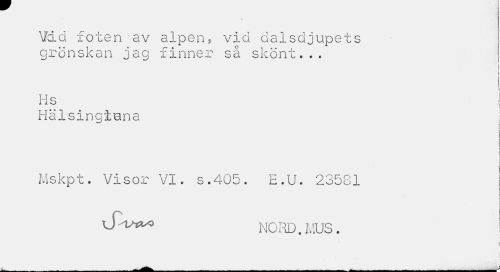 //// Vad foten av alpen, vid dalsdjupets grönskan jag finner så skönt... //// H s //// Hälsingiana //// i //// i //// i I //// i //// Ivlskpt. Visor VI. s.405. E.U. 23581 I //// dm* NORD. MUS. //// •••i ////