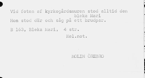 //// f i //// Vid foten af kyrkogårdsmuren stod alltid den //// bleka Mari Hon stod där och såg på ett brudpar. //// B 163, Bleka Mari, 4 str. //// Mel.not. - //// i //// MOLIN ÖREBRO ////