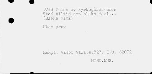 //// IVid foten av kyrkogårdsmuren Stod alltid den bleka Mari... ^ (Bleka Mari) //// Utan prov //// Mskpt. Visor VIII.s.527. E.U. 32072 //// NORD.MUS. //// / ////