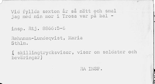 //// Vid fyllda sexton år så nätt och smal jag med min mor i Trosa var på bal - //// insp. Rtj. 8866:5-6 //// Rehnman-Lundeqvist, Maria Sthim. //// X skillingtrycksvisor, visor om soldater och beväringar) //// RA INSP. | ////