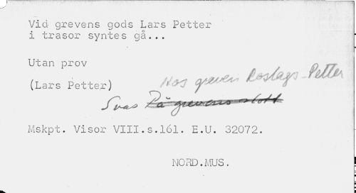 //// /"v //// Vid grevens gods Lars Petter i trasor syntes gå... //// Utan prov , g //// (Lars Petter) f***» - \ //// Mskpt. Visor VIII.s.161. E.U. 32072. //// NORD.MUS. ! //// ¦ ////