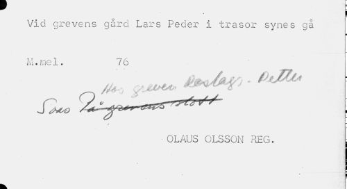 //// s //// Vid grevens gård Lars Peder i trasor synes gå //// ¦ //// M.me1. 76 //// ¦ OLAUS OLSSON REG. : //// k. ////