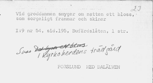 //// «- -< : r - " •> •" -r . //// Vid groddammen smyger om natten ett bloss, -som sorgeligt frammar och skiner //// 1:9 nr 54, sid.195, Bufärdslåten* 1 str. //// FORSLUND MED DALÄLVEN ////