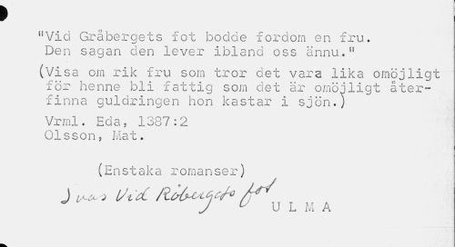 //// } //// n Vid Gråbergets fot bodde fordom en fru. Den sagan den lever ibland oss ännu.11 //// (Visa om rik fru som tror det vara lika omöjligt för henne bli fattig som det är omöjligt återfinna guldringen hon kastar I sjön.) //// Vrml. Eda, 1387:2 Olsson, Mat. //// (Enstaka romanser) //// J ^ * l/td /Icr^Y^ //// ^ J U ULMA ////