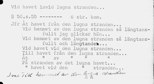 //// Vid havet invid lugna stranden... B 50,s.55--- 6 str. kom. //// ° o //// Jfr At havet fran den lugna stranden... //// Vid hemmet av den lugna stranden så längtans- //// fullt jag glickar hän... Vid hemmet av den lugna stranden så längtans- //// fullt och längtande*... Via havet vid den lugna stranden... Till havet från den lugna stranden... At 11 av 11 n » //// På stranden av det lugna havet... " havet vid den n stranden... ////