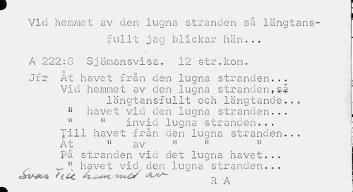 //// i //// Vid hemmet av den lugna stranden sä langtans- //// fullt jag blickar hän... //// A 222:8 Sjömansvisa. 12 str.kom. //// o c //// Jfr At havet fran den lugna stranden... //// Vid hemmet av den lugna stranden,så //// längtansfullt och längtande... n havet vid den lugna stranden... , //// " ,f invid lugna stranden... Jill havet från den lugna stranden... j: //// At 51 av ,l " " //// På stranden vid det lugna havet... havet vid den lugna stranden... //// 11 i\ ////