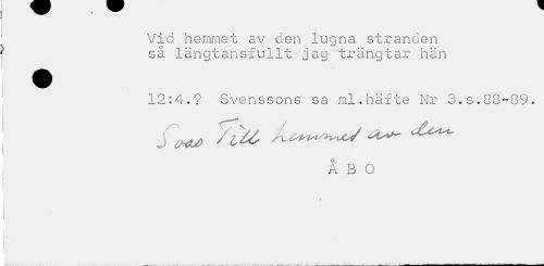 //// Vid hemmet av den lugna stranden sä längtansfullt jag trängtar hän //// 12:4.? Svenssons sa ml.häfte Nr 3.s.88-89. //// fw Yiu ^ //// ÅBO ////