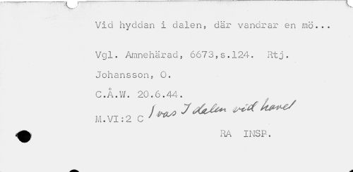 //// Vid hyddan i dalens där vandrar en mö... //// Vgl. Amnehärad, 6673,s.124. Rtj. Johansson, O. C.Å.W. 20.6.44. //// M.VI:2 ////